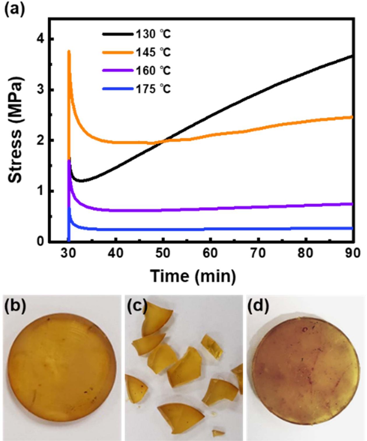 Fig. 3 (a) Stress relaxation curves of the HDCNs at different temperatures. Photographs of (b) PHT sample prepared through the method of preparing the hBN-PHT composite, (c) PHT sample crushed into pieces, and (d) reprocessed PHT sample by hot pressing at 180°C, 5 MPa for 2 h. Reproduced from ref. 5 with permission from Elsevier |