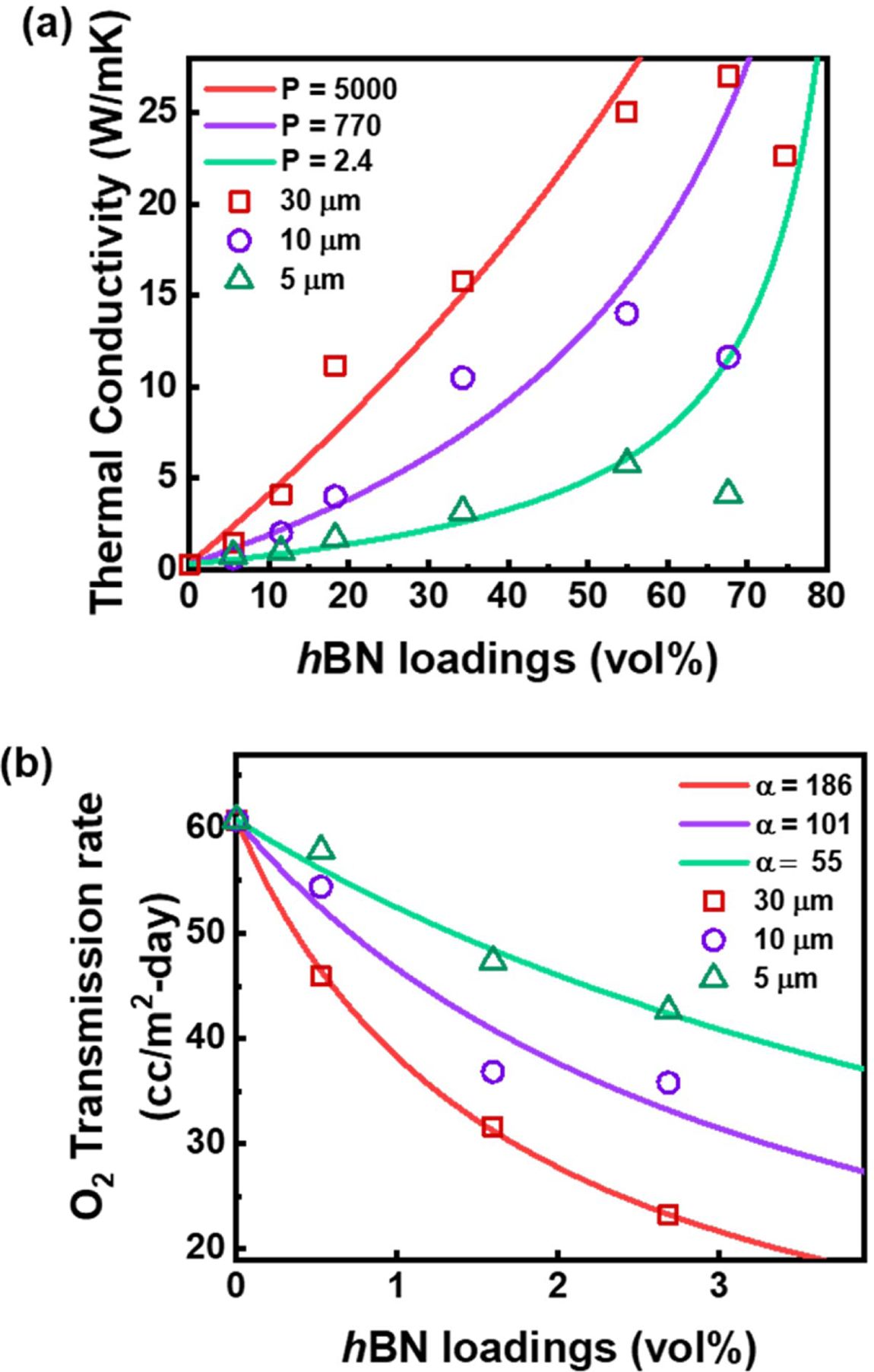 Fig. 4 (a) Isotropic thermal conductivity of the hBN-PHT composites containing hBN with different sizes. Lines representing model predictions calculated by Lewis-Nielson equation. (b) Oxygen transmission rate at steady state of the PHT-hBN composites with different sizes of hBN. Reproduced from ref. 5 with permission from Elsevier |