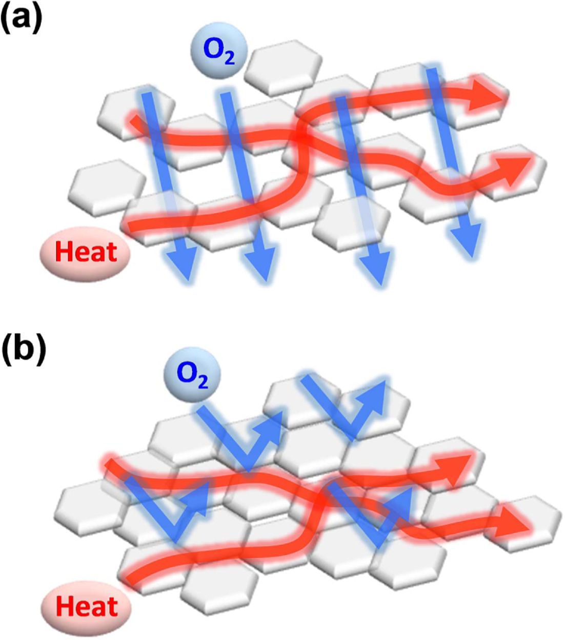 Fig. 5 Schematic showing the heat pathway (red arrow) and oxygen (blue arrow) transmission path in the hBN-PHT composites. Both schemes in (a) and (b) show the composites with similar effective filler aspect ratio, while the filler contact area is smaller in case of (a) than in (b) |