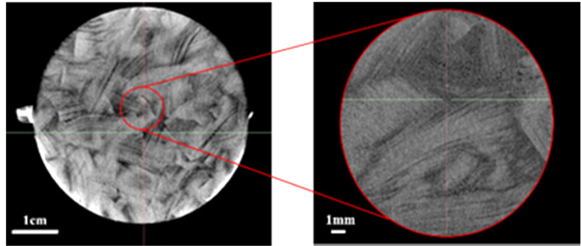 Fig. 1는 micro-CT 촬영 이미지로 섬유칩의 배향 및 분포를 확인할 수 있다. Fig. 1 오른쪽은 확대 이미지이며, 해당 정보를 바탕으로 섬유칩을 구성하는 장섬유는 굴곡이 없는 것으로 파악할 수 있다.