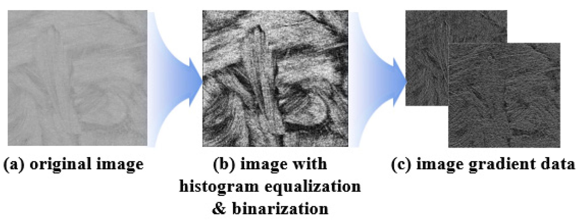 SMC내 섬유의 배향 정보 획득을 위해 gradient method를 사용한다. Gradient method는 이미지의 grayscale 차이를 통해 픽셀 단위의 법선 벡터를 계산하는 방법이다[5]. 이 때, 정확도를 높이기 위해 micro-CT 이미지에 나타나는 섬유와 기지를 명확하게 구분해주기 위한 히스토그램 평활화(equalization)와 픽셀 이진화(binarization)를 수행한다. 이후 단위 픽셀에 대해 X,Y축 방향 구배(∂X, ∂Y) 및 grayscale value 변화량(∂I)을 계산 후 이를 바탕으로 image gradient (∇I) 및 방향 정보를 획득한다. 이 때 M과 G는 각각 image gradient의 크기와 방향을 의미한다. 이에 대한 내용은 아래 수식과 Fig. 2에 정리되어 있다.