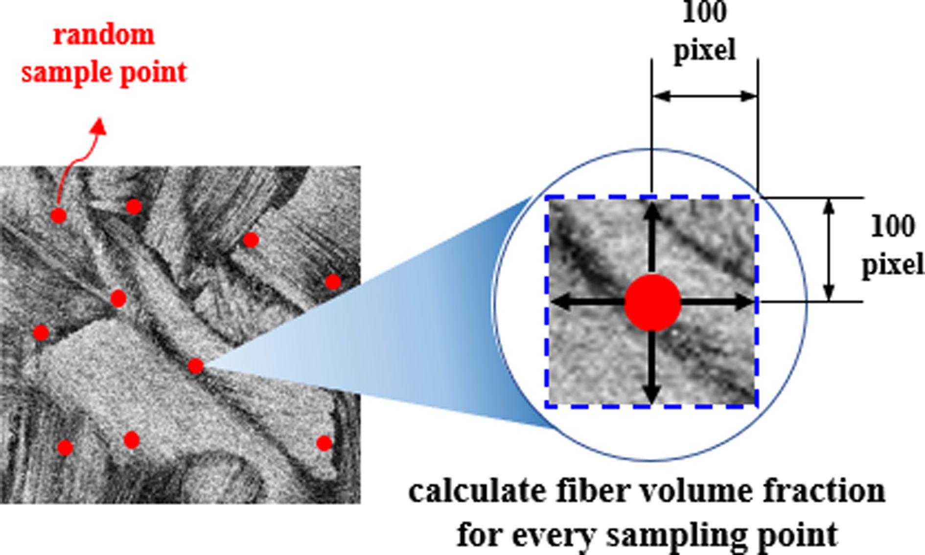 본 연구에서는 통계적으로 유의미한 데이터 획득을 위해, CT 이미지당 1000개의 랜덤 샘플 포인트(random sample point)를 생성 후, 각 포인트로부터 일정 범위(100 pixel)내에 존재하는 이미지 픽셀들의 섬유 부피분율을 계산하였다. 이에 대한 자세한 과정은 Fig. 3에 정리되어 있다.