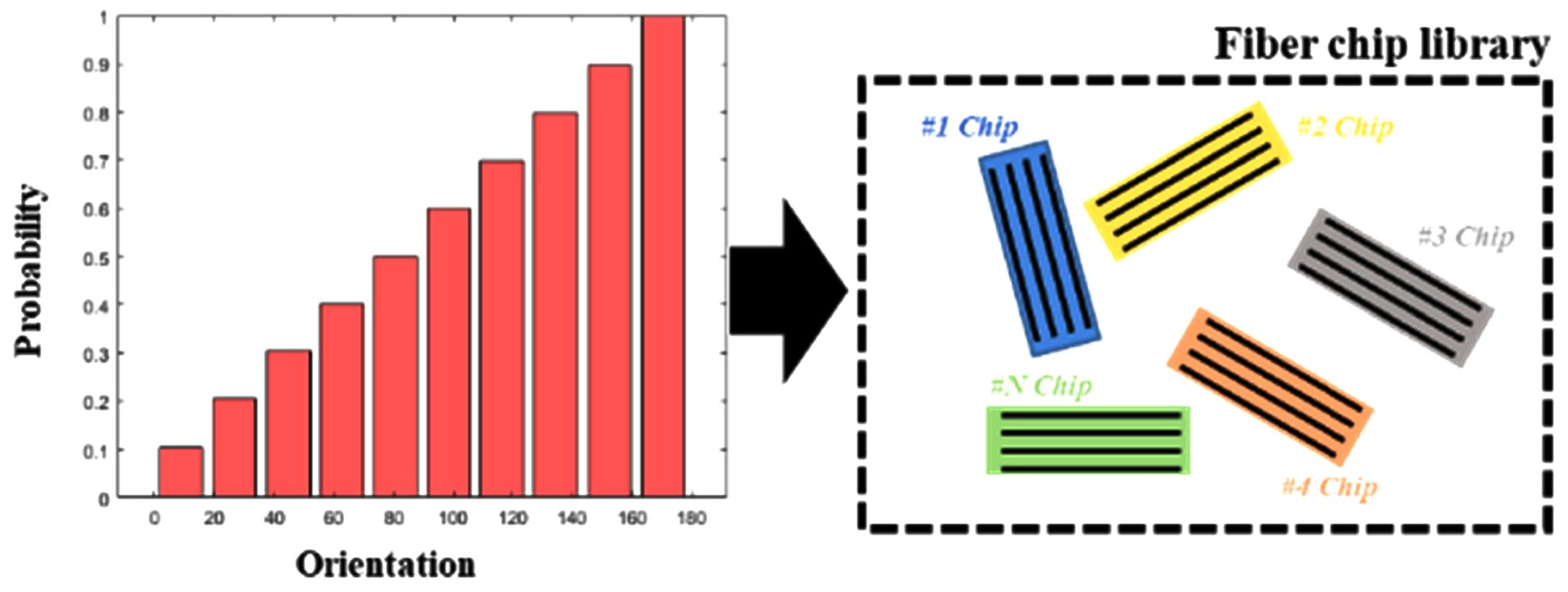 위 식에서 NL는 단층의 SMC 판에서 목표 부피분율을 채우기 위한 섬유칩의 개수이다. 여기서 주의할 점은, 섬유칩의 개수는 정수이기 때문에, 모든 섬유칩을 팩킹 후에 목표로하는 부피분율과 정확히 일치하지 않을 수 있다. 결과적으로 섬유칩 개수와 배향을 바탕으로 섬유칩 라이브러리를 Fig. 4와 같이 생성한다. 해당 데이터는 실제 이미지 프로세싱을 통해 얻은 섬유칩의 배향 CDF 데이터이다.