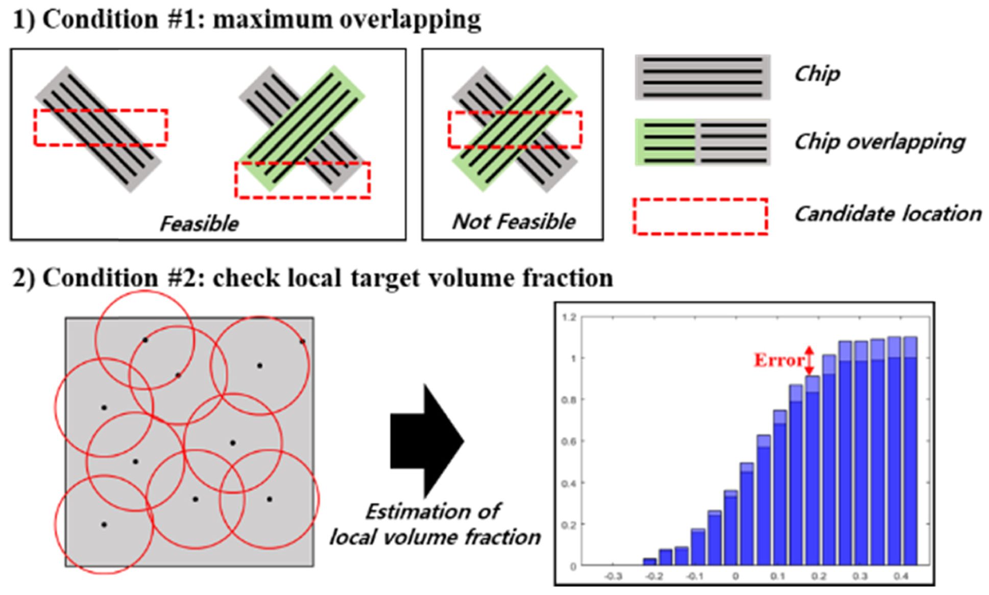 첫번째, 섬유칩이 판에 팩킹될 때 두 번 이상 겹쳐질 수 없다. 겹침 갯수에 제한을 준 것은 일반적으로 SMC 복합재료를 제작할 때, 최대한 고르게 섬유칩을 분포시키기 때문이다. 추가로 섬유칩의 겹침 허용양을 증가시킬 경우 불균형한 SMC 복합재료를 표현할 수 있기 때문에, 실제 SMC 복합재료 모사를 왜곡할 수 있다.