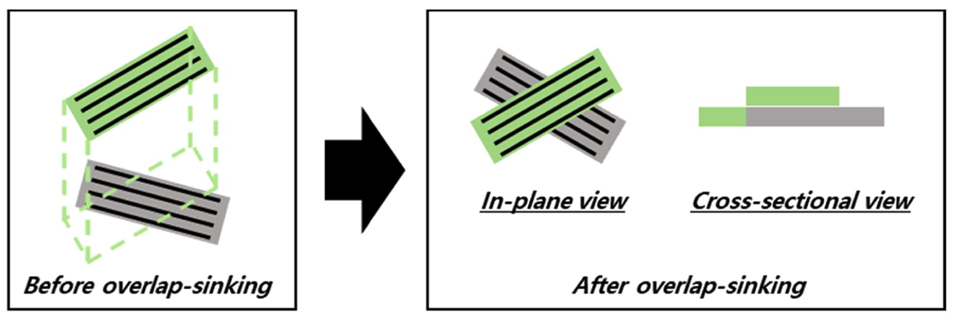 만일 이 두 가지 조건에 부합한다면 섬유칩의 팩킹을 수행할 수 있다. 다만, 팩킹을 진행할 때, 실제적인 섭유칩끼리 겹침에 의한 굴곡(undulation)을 표현하기 위해 Fig. 6와 같이 겹치는 부분이 위층으로 올라가고, 겹치지 않는 부분은 해당층에 위치하도록 한다. 이러한 알고리즘은 실제 섬유칩의 팩킹에 의한 물리적인 현상을 직접적으로 반영함으로 보다 정확한 SMC 복합재료 모델링이 가능하다.