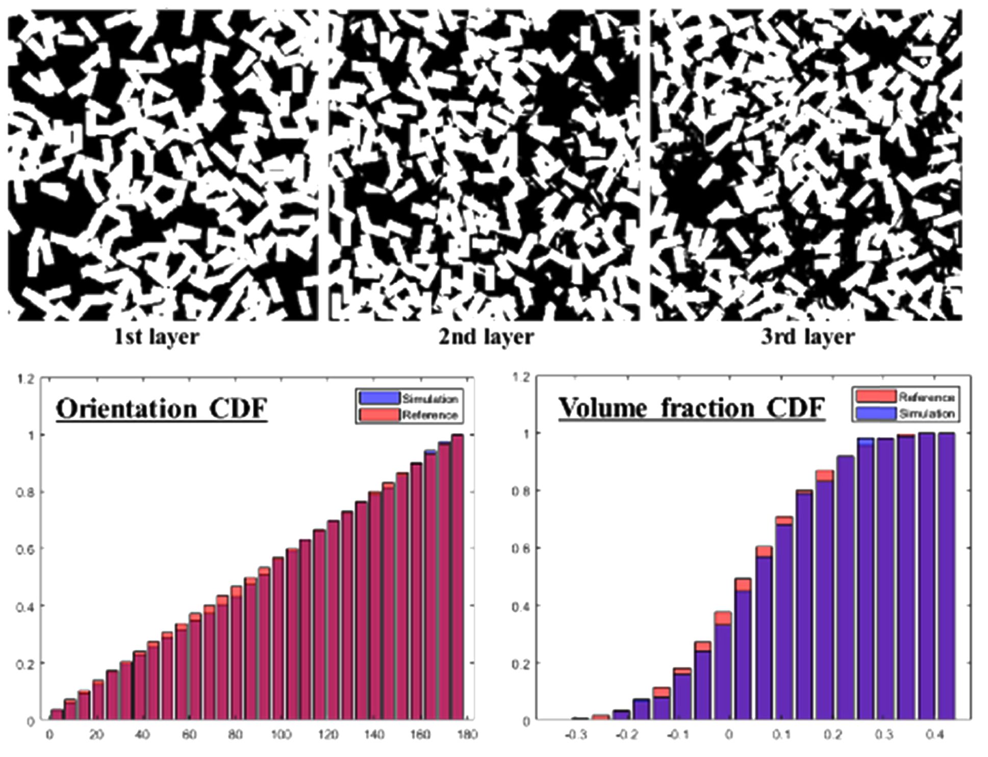 두번째, 섬유칩을 팩킹 시 마다 샘플 포인트에서 SMC의 부피분율을 계산하여 micro-CT 이미지 프로세싱을 통해 얻은 CDF와 비교하여 오차가 허용범위를 넘는지 확인한다. 이미지 프로세싱으로부터 얻은 CDF 결과에 허용 오차 이상으로 차이가 날 경우, 새로운 위치로 새롭게 조건을 확인한다. Fig. 5의 하늘색으로 표시된 CDF그래프는 이미지 프로세싱을 통해 얻은 SMC 복합재료의 부피분율 분포이다.