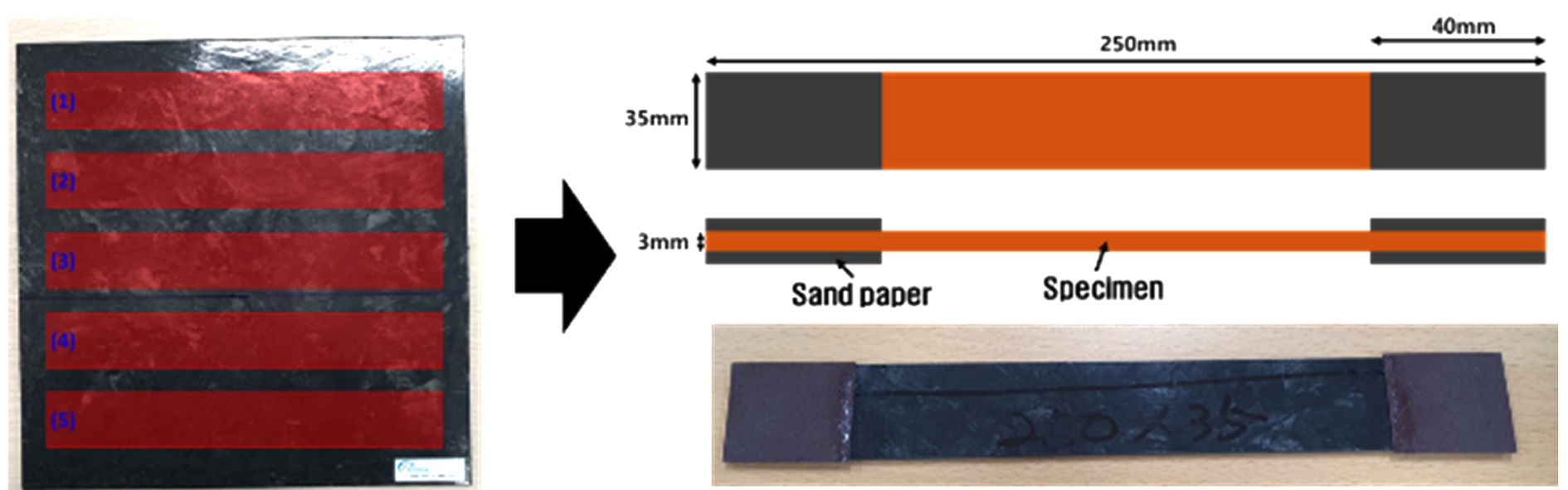 SMC 복합재료의 물성을 파악하기 위해, 인장시편 실험을 수행하였다. 제작된 SMC 판에서 구역을 나눠 35 mm의 폭을 가지는 ASTM D3039 규격의 인장 시편을 준비하였으며, 이에 대한 자세한 규격은 Fig. 10에 정리되어 있다.