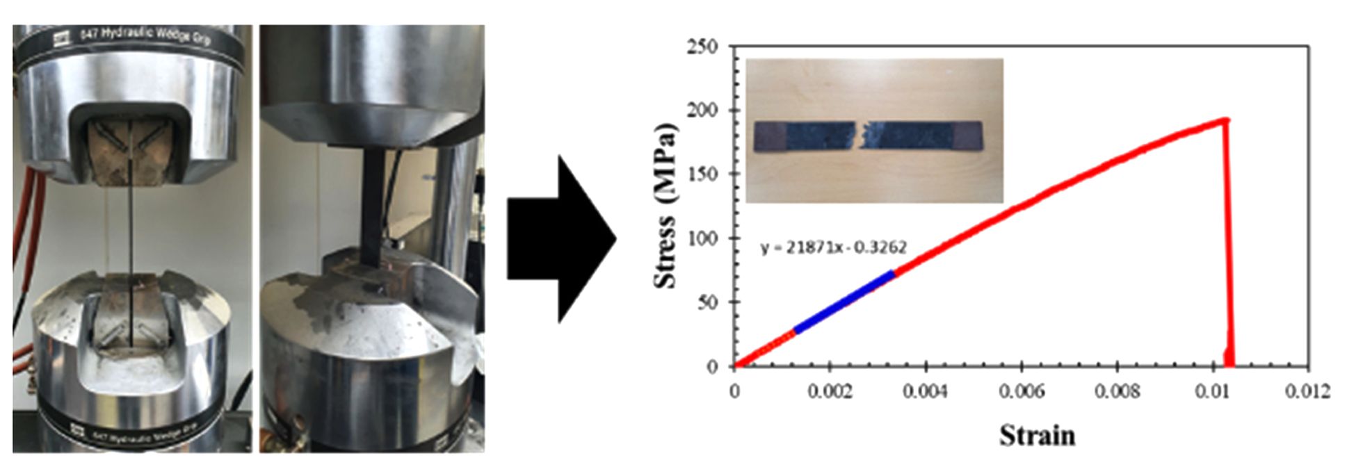 위치에 따라 제작된 인장시편은 MTS 810장비를 이용하여 1 mm/min의 strain rate으로 인장시험을 수행하였으며, 변형률-응력 커브에서 SMC 복합재료는 선형 거동이 두드러지는 취성성질을 가지는 것을 확인할 수 있었다. 인장 시험을 통해 SMC 복합재료의 탄성계수(Elastic Modulus)를 측정하기 위해 0.05%~0.25%의 변형률 범위에서 측정하였다. 해당 내용은 Fig. 11에 정리되어 있다.