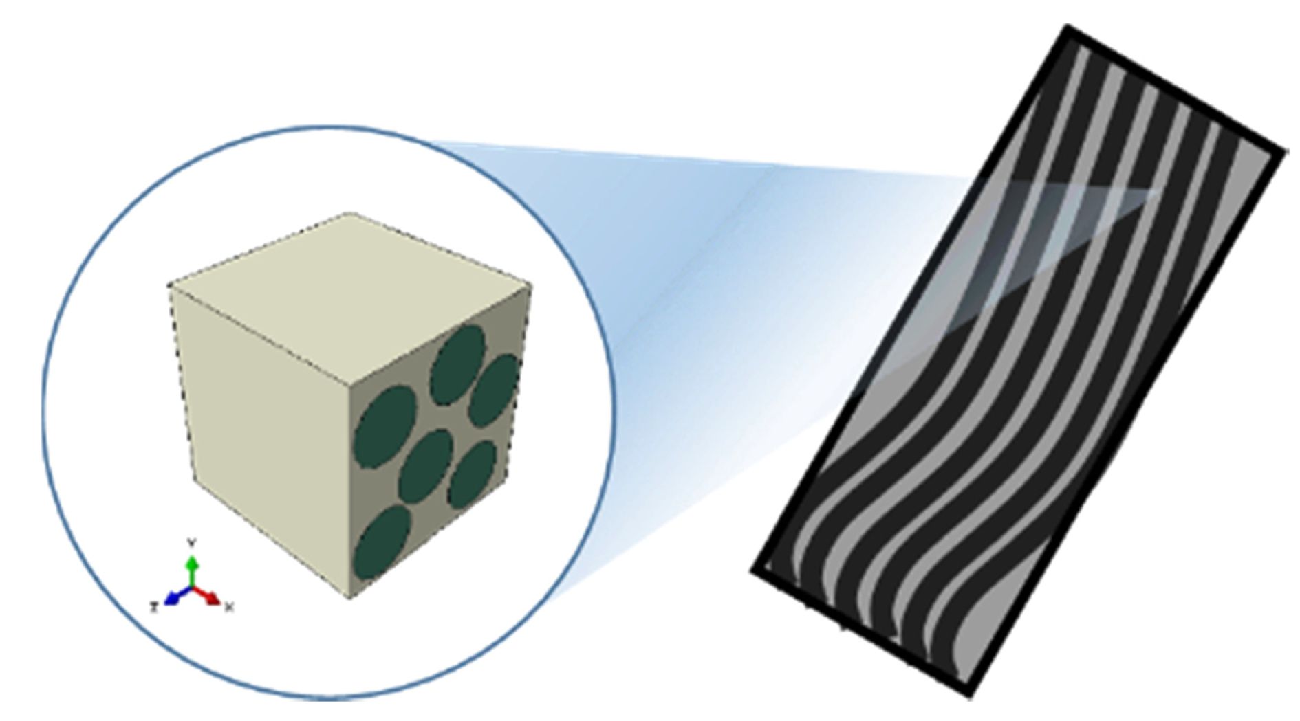 SMC 복합재료 RVE 재구성 알고리즘 검증을 위해 실험데이터와 비교를 수행한다. 이미지 프로세싱을 통해 얻은 섬유칩의 배향과 부피분율 분포를 바탕으로 얻은 SMC RVE 유한요소해석을 수행한다. 해석을 수행하기 전, 섬유칩을 구성하고 있는 T700 섬유와 비닐에스터 기지의 물성을 통해 SMC를 구성하고 있는 섬유칩의 물성을 계산하였다. 섬유칩을 구성하고 있는 섬유와 기지의 물성은 Table 3에 정리되어 있으며, 섬유칩의 등가물성을 계산하기 위한 마이크로 스케일(micro-scale) RVE는 모델은 Fig. 12에 나타나 있다.