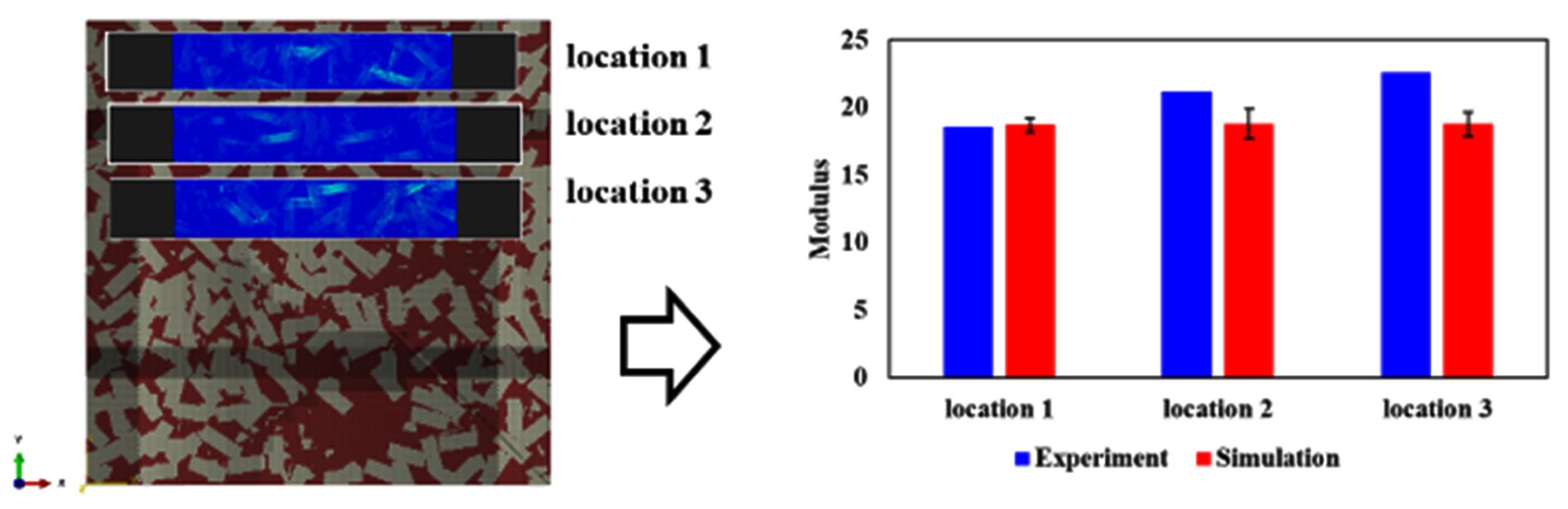 Fig. 13 Location of specimens in SMC plate and comparison between elastic modulus in simulation and experiment |