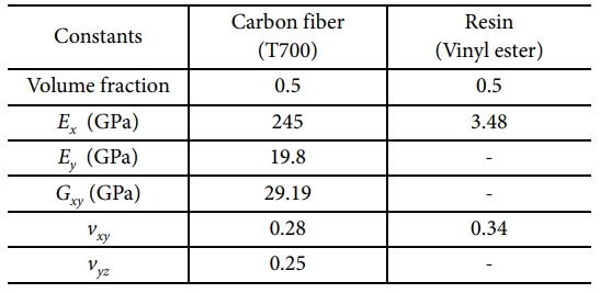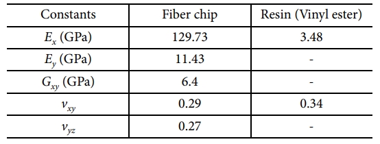 RVE 모델에 균질화를 통해 섬유칩의 등가물성을 얻기 위해 미소구조의 변형을 가장 잘 모사할 수 있는 주기경계조건(PBC: Periodic Boundary Condition)을 활용하였으며, 단위 변형률에 대한 응력 결과를 평균장(average field) 이론을 사용하여 등가물성을 획득하였다. 균질화에 대한 보다 자세한 설명은 Lim[7]의 논문을 참고하면 되며, 균질화를 통해 얻은 섬유칩의 등가물성은 Table 4에 정리되어 있다.