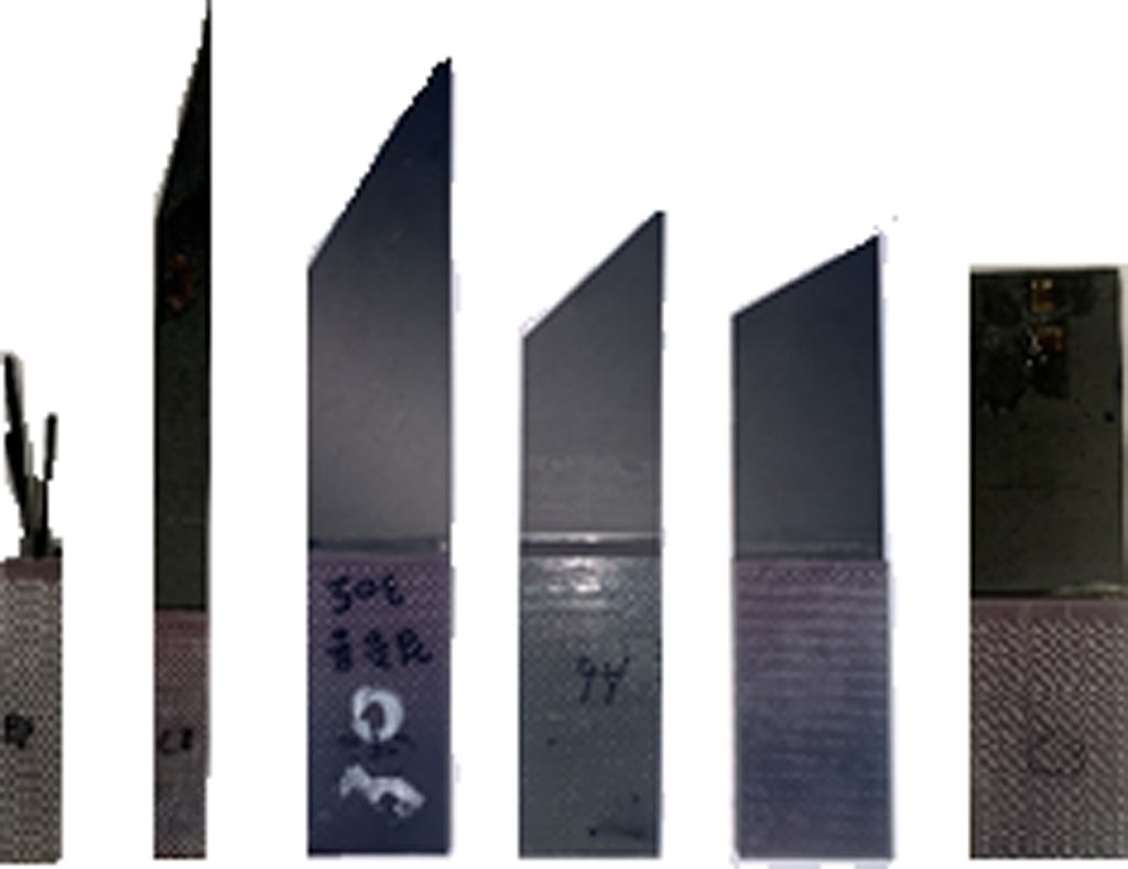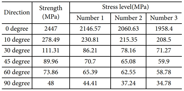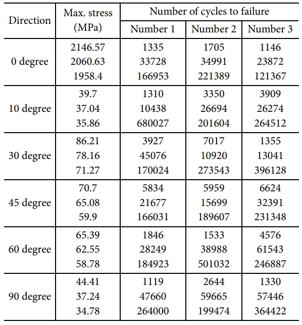 피로 시험을 수행할 때 필요한 피로 하중을 도출하기 위해 시편에 대한 비낌 축(0o, 10o, 30o, 45o, 60o, 90o)에 따라 인장 시험을 수행하였다. 이를 통해 각 비낌 축 시편에 피로 하중을 가해줄 때의 최대 응력 σmax를 도출하였다. 실험 결과는 Table 1에 나타내었으며 각 인장 실험은 2회씩 반복한 값의 평균을 사용하였다. 인장 시험에 대한 비낌 축에 대한 복합재 파단 시편은 Fig. 4에 나타내었다.