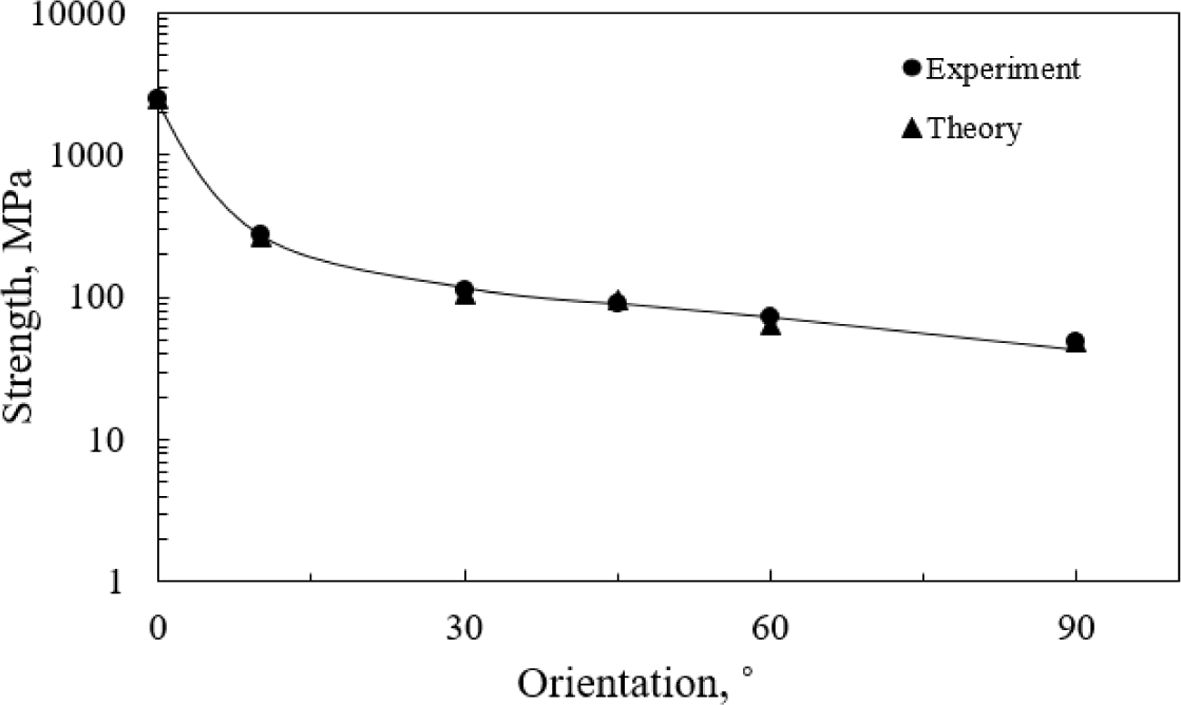인장 시험 결과를 보았을 때, 복합재의 0o 방향에서 90o 방향으로 각도가 커질수록 더 작은 인장 강도가 도출되는 것을 확인하였다(Fig. 5). 그 이유는 축 방향 즉, 0o 방향으로 인장을 가해주었을 때 섬유(Fiber)의 영향을 많이 받으며 90o 방향으로 갈수록 모재(Matrix)에 영향을 받기 때문이다. 이 결과를 Maximum stress 이론을 통해서 예측한 비낌 축에 따른 복합재의 인장 강도와 비교하였다. Maximum stress 이론에 따르면 인장 하중을 받는 복합재의 파단 양상은 비낌 축에 따라서 Fiber failure, Shear failure, Transverse tensile failure로 달라진다. 파단 양상에 따른 파단 강도 이론 식은 다음과 같다.