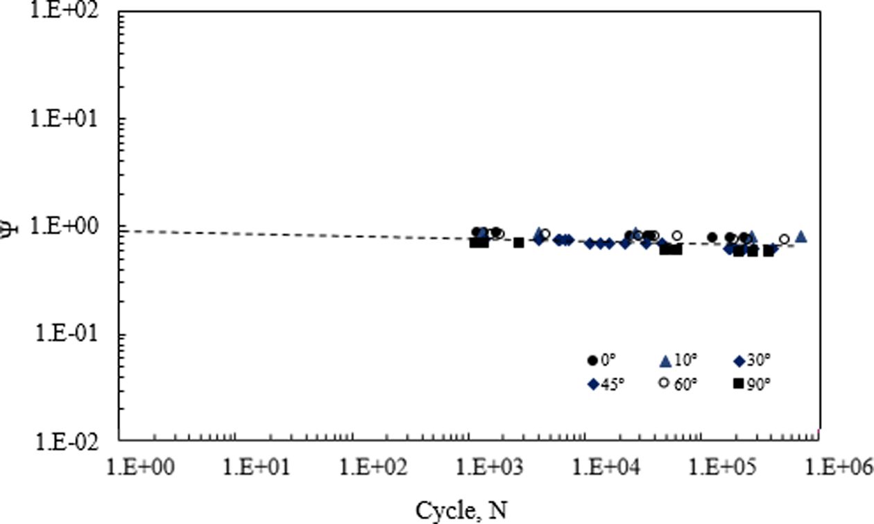 피로 강도 비율은 정적인 파단 경향을 정량적으로 나타낸 값이다. 즉 정적 파단 조건은 Ψ=1로 표현된다. 이러한 피로 강도 비율을 이용하면 비낌 축과 관계없이 피로 수명을 하나의 단일 곡선으로 표현할 수 있다(Fig. 7). Fig. 7로부터 섬유 방향과 무관하게 좁은 범위에서 수정 피로 강도 비율이 분포되는 것을 확인하였다. 따라서 일부 비낌 축 각도 복합재의 피로 선도만으로도 피로 강도 비율-피로수명 선도로의 평준화를 통해 다른 비낌 축을 가진 동일한 복합재의 피로 수명 예측이 가능함을 알 수 있다. 이는 동일한 응력비 조건에서 비낌 축 각도 복합재료의 피로 수명을 예측할 때 적용할 수 있으며 CFRP외 복합재료의 적층 각에 따른 피로 수명을 예측하는 기법으로 활용될 수 있다.