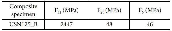 여기서 q는 비낌 축 각도이다. 비낌 축 각도에 따른 복합재료 인장 강도를 예측하기 위하여 길이 방향 인장 강도(F1t), 횡 방향 인장 강도(F2t), 전단 강도(F6)는 ASTM D3039/D3039M-17 규격에 의거한 시험을 통해 도출하였고 물성은 Table 2와 같이 도출하였다. 이에 기반하여 각 파단의 영역을 비교한 결과 Fig. 5와 같이 모든 각도에서 이론과 유사한 경향을 보임을 확인하였다.