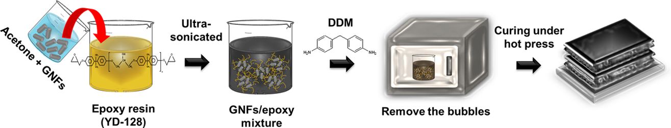 Fig. 1 illustrates the composite preparation process. First, different concentrations of GNFs (0.2, 0.4, 0.6, 0.8, or 1.0 wt%) were added to an epoxy resin/acetone mixture and ultra-sonicated for 20 min. Afterward, mixture was heated in an oven at 80°C for 15 h to remove the acetone. A curing agent (DDM) was dispersed within the mixture according to an established method using a planetary mixer. These procedures the resultant suspension was degassed in a vacuum oven at 70°C for 1 h to eliminate air bubbles. After bubble removal, the resulting suspension was continuously impregnated with CFs using a three-roll milling machine to manufacture the prepregs. Finally, the prepregs were cured at 60°C for 2 h and 120°C for 2 h, followed by 2 h of post-cure at 170°C. We denoted the specimens of GNFs/CFs/epoxy composites as GCE composites.
