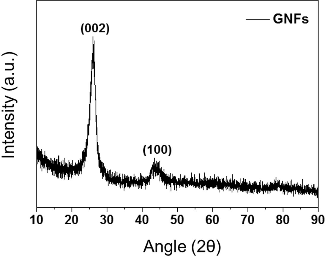 XRD analysis was performed to investigate the crystallographic nature of GNFs, the results of which are shown in Fig. 2. The XRD pattern of the GNF shows two broad peaks at 2θ = 26.2 and 43.5° corresponding to the (002) and (100) planes of the hexagonal graphitic structure, respectively [18,19].