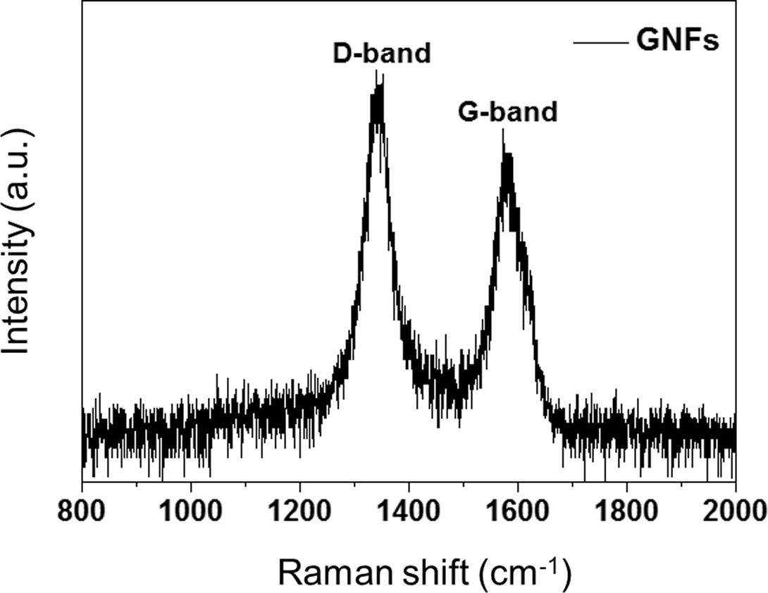 Fig. 3 presents the Raman spectra of the GNFs. The wide D-bands near 1340 cm−1 presented the prismatic surface (sp3 hybridized carbon) in the hexagonal framework of the GNF walls, representing covalent bonds of the oxygen containing groups. The small G-bands observed near 1582 cm−1 corresponded to the basal plane (sp2 hybridized graphitic layers). As a result, the prismatic surface of GNFs could be undertaken to significantly enhance interfacial adhesion.