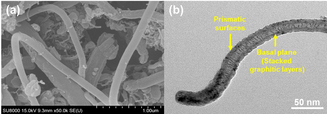 The microstructures of GNFs were observed by SEM and TEM, as shown in Fig. 4(a-b). As evident in Fig. 4(a-b), the GNFs were fairly straight and highly ordered structures. The outer surface is covered by a very thin prismatic layer, whereas the inside of the nanofiber shows stacked graphitic layers of the herringbone type.