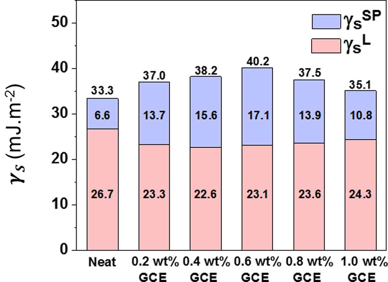 The CA and surface free energy results for the GCE composites, as calculated using Eq. (6), are reported in Table 2 and Fig. 5.