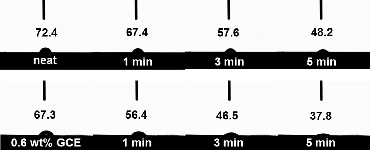 To support this explanation, we studied the wetting behavior of distilled water (carried out at 27°C for 5 min) acting on the neat and GCE composites in more detail. It can be seen in Fig. 6 that the CAs of the neat composites near 48.2° showed no obvious changes, while the CAs of the 0.6 wt% GCE composites decreased very rapidly and saturated at around 37.8°. This decrease is due to the surfaces with a large number of hydrophilic groups on the GNFs, from which water droplets could quickly diffuse, indicating that the improved interfacial interaction between GNFs and epoxy matrixes [23,24].