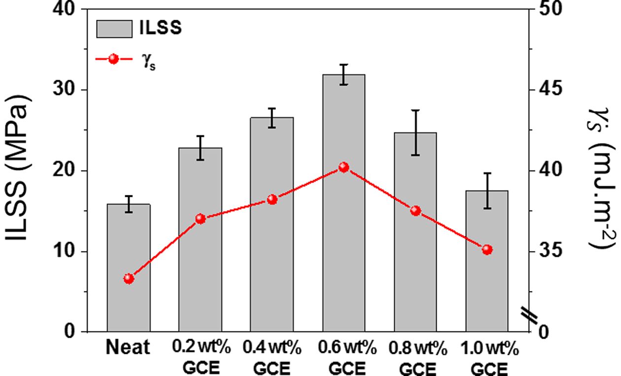 The ILSS is one of the appropriate measurements for determining the interfacial adhesion [25,26]. The out-of-plane interfacial adhesion of GCE composites was performed by ILSS defined at the interface between CFs and epoxy matrix. As illustrated in Fig. 7, the GCE composites exhibit excellent linearity for the relationship between the ILSS and surface free energy, which clearly demonstrating improved interfacial adhesion. As a result of this evaluation, the 0.6 wt% GCE composites had the highest value of ILSS 31.9 MPa, 101.9% higher than the 15.8 MPa of the neat composites. These results suggest that additional interfacial interlocking was achieved when the GNFs were included within the epoxy matrix, resulting in enhanced interfacial adhesion. Meanwhile, in the 0.8 wt% GCE composites (24.7 MPa), GNFs tended to excessively bond with itself rather than with the epoxy matrix because of its strong van der Waals force. This reduces the shear propagation energy, thus leading to a decrease in ILSS.