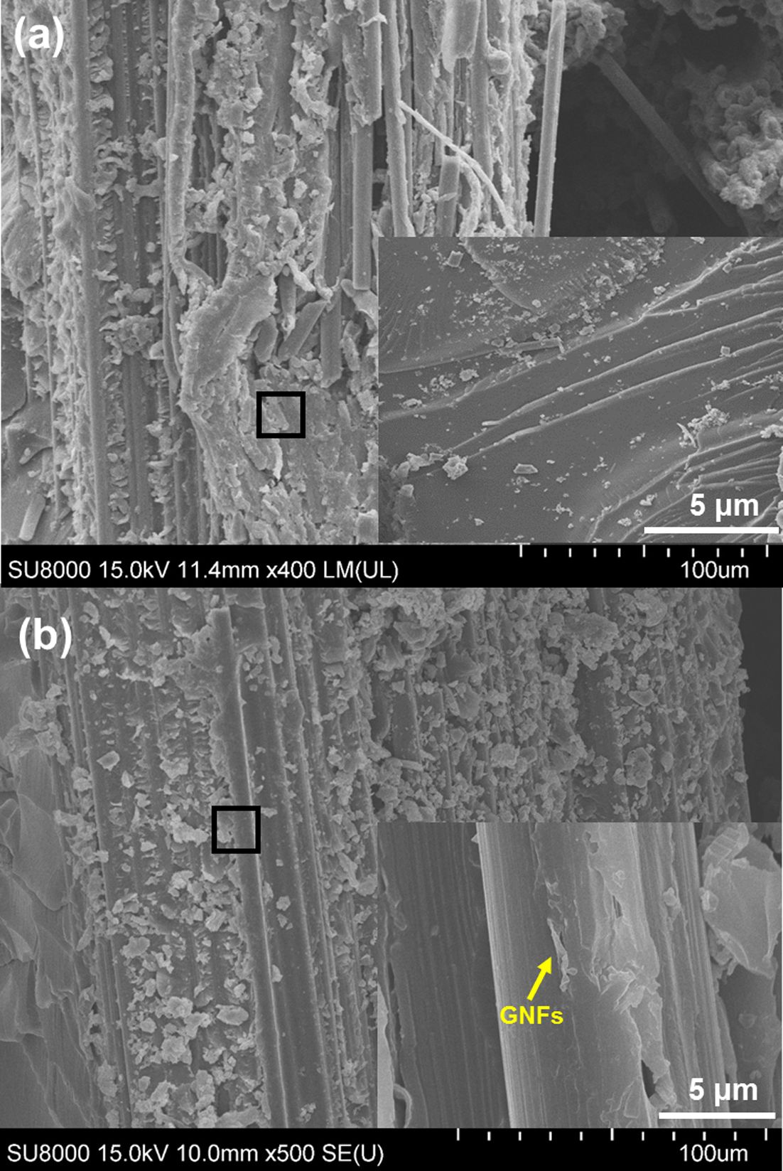 We observed the fracture surfaces in more detail to study the fracture mechanisms acting on the GCE composites. As shown in Fig. 9(a), the cracks in the neat composites propagate directly through the interface of the CFs/epoxy matrix, and adhesive failure occurs. In this case, the composite shows a smooth fracture surface, which is typically a brittle fracture of the epoxy resin [30]. On the other hand, the 0.6 wt% GCE composites exhibited crack progression almost proprietarily along the GNF-rich interlayer and were tightly embedded within an epoxy matrix without de-bonding (Fig. 9(b)). This inhibits propagation through the epoxy matrix as a crack must pass either through or around areas with GNF-rich interlayers, resulting in an enhanced KIC.