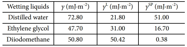 The surface free energy of the composites is directly related to their interfacial adhesion. To obtain accurate surface free energy information for the composites, these values are calculated on the basis of the CAs [20-22]: