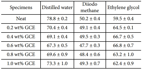 To evaluate the influence of added GNFs on the interfacial adhesion of the GCE composites, their contact angles (CA) were measured using the sessile drop method on a Rame-hart contact angle goniometer (CA, Marktech Co, Korea). At room temperature (27 ± 1°C), at least 5 valid tests were carried out and the mean value with a standard deviation lower than 1° was reported for each specimen. Standard liquid characteristics of surface free energy are shown in Table 1. According to Owens [15], Fowkes [16], and Kaelble [17], the γ is the surface free energies, γL is the London dispersion components (Lifshitz-van der Waals that includes London dispersion forces), and γSP is the specific polar components Keesom’s orientational force, dipole-induced dipole, hydrogen bonding, Debye-inductive polarization).