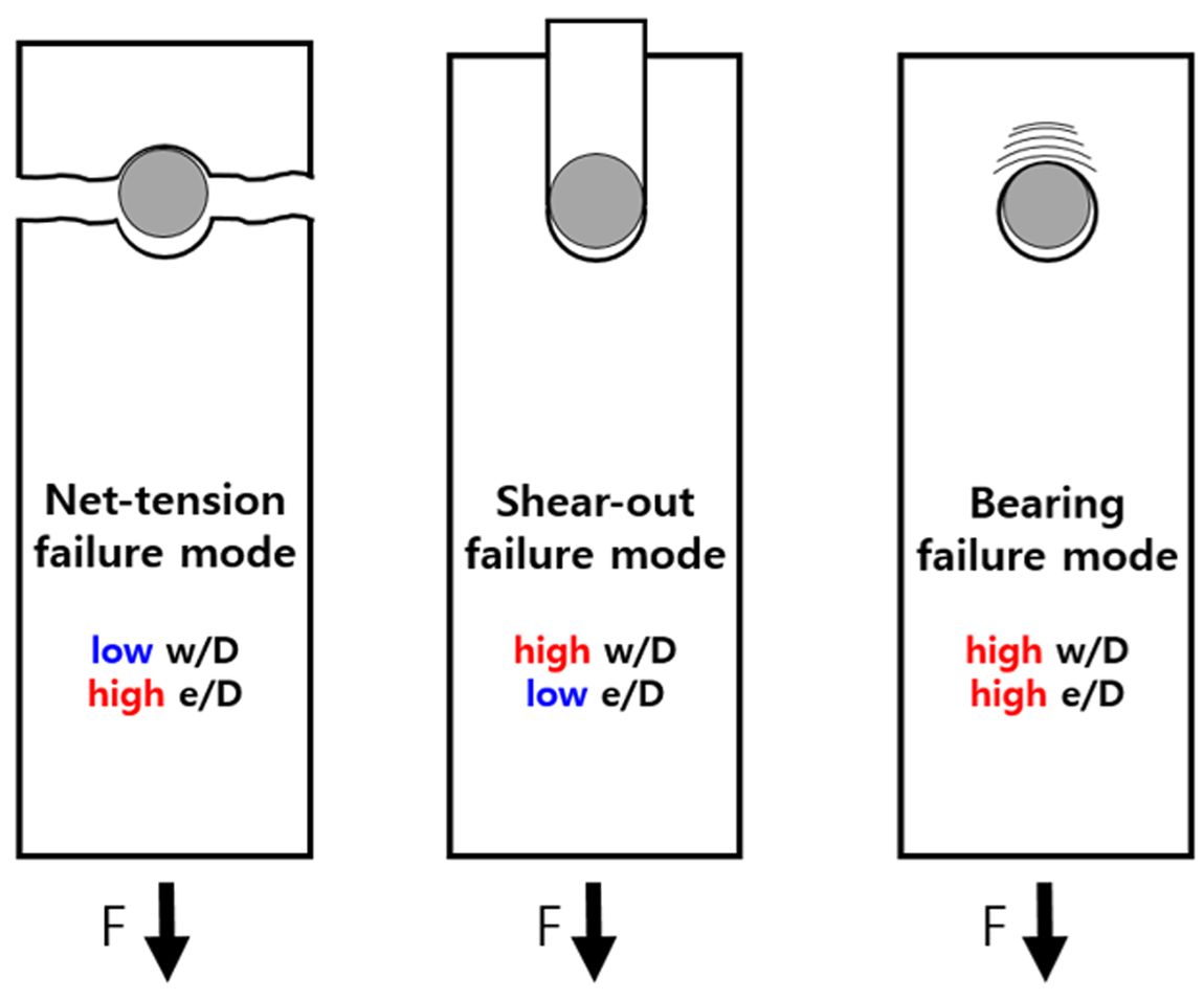 복합재료 볼트 조인트는 몇 가지 파손모드를 보이며 파손이 진행된다. 복합재료 볼트 조인트에서 볼트의 파손과 복합적인 파손을 제외하면 대표적으로 세 가지의 파손모드를 관찰할 수 있다. Fig. 1은 복합재료 볼트 조인트의 대표적인 파손모드를 보여준다. Net-tension, shear-out 파손모드는 초기 발생된 파손이 빠르게 최종 파단으로 연결되며 급격하게 조인트의 하중전달능력이 상실된다. 반면에, bearing 파손모드는 파손이 시작되면서 섬유 및 기지가 점차 구겨지게 되고 점진적인 파손 진전 형태를 보여준다. 이러한 파손모드는 복합재료 볼트 조인트의 기하학적 설계 요인들에 의해 결정될 수 있다. 복합재료 부품의 폭(w), 끝 단에서 볼트 구멍 중심까지의 거리(e), 그리고 볼트 구멍의 직경(D) 와 같은 설계 변수들에 의해 파손모드가 달라지게 된다. ASTM D5961[5]에서는 bearing 파손모드의 설계를 위해 e/D 비를 3 이상으로 제시하고 있다. 대체적으로 w/D 비가 작고, e/D 비가 큰 경우에는 net-tension 파손모드가 발생되며, w/D 비가 크고, e/D 비가 작은 경우에는 shear-out 파손모드가 발생된다. Bearing 파손모드는 다른 파손모드들과 다르게 비선형 응력-변형률 관계를 보여준다. 볼트 조인트에서 응력-변형률 거동은 베어링 응력-베어링 변형률 관계로 표현하며, 그 계산방법은 아래와 같다.