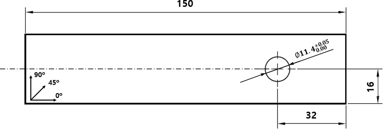 제작하였다. 복합재료 시편의 치수는 Fig. 2에서 볼 수 있다. e/D 비는 2.8로 설계되었다. 시편의 두께는 6 mm로 [0/+45/0/-45]5S의 적층으로 제작되었다. 볼트가 체결되는 구멍의 직경은 11.10 mm이며 볼트와 구멍의 공차는