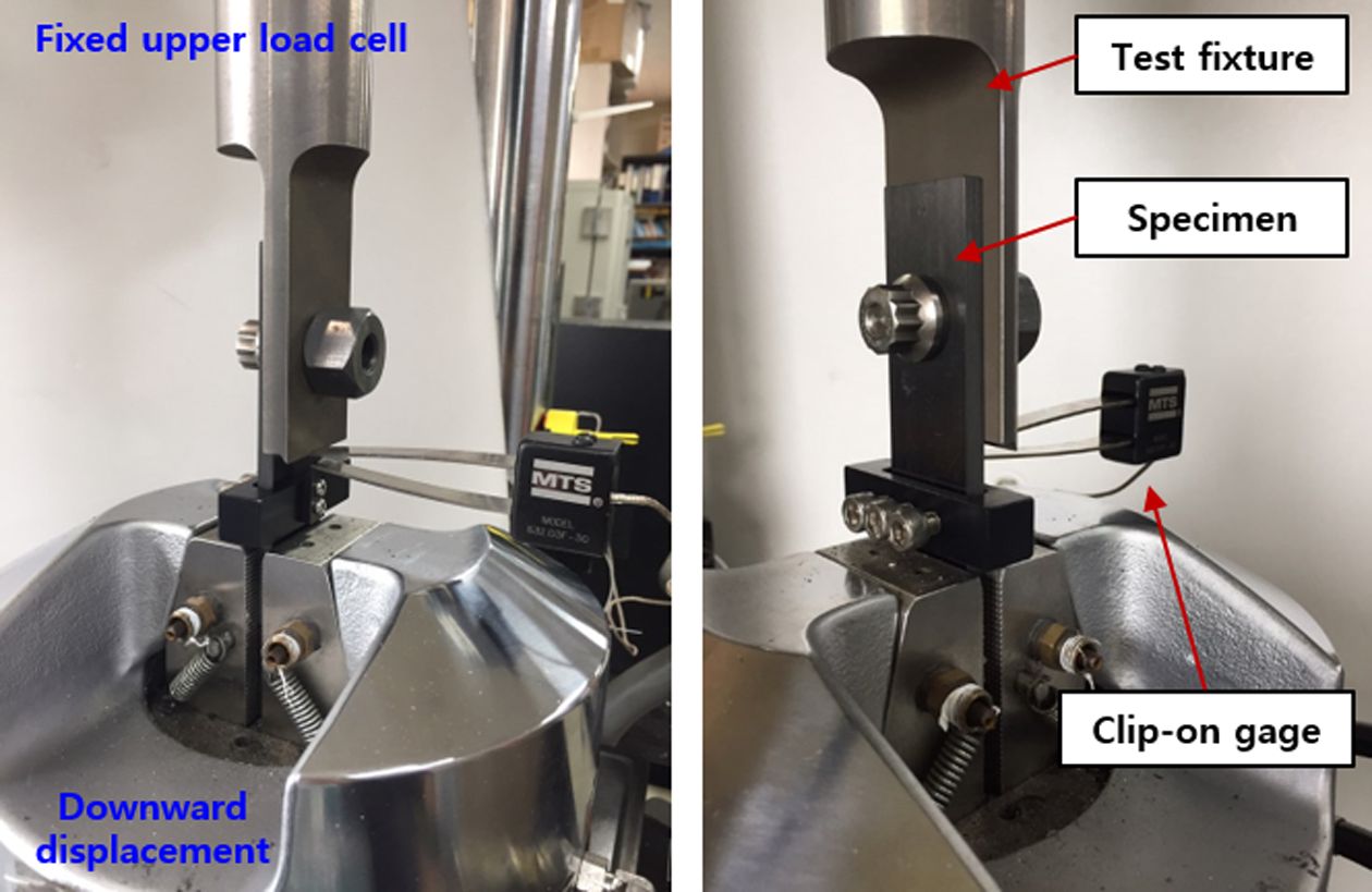 복합재료 볼트 조인트 시험은 ASTM D 5961[5]의 Procedure C를 참고하여 설계되었다. 단일 접합 볼트 조인트를 구성하여 시험을 수행하였으며, MP35N 고강도 볼트를 이용하여 체결하였다. 볼트의 체결은 체결력을 20, 500, 700 kgf-cm로 달리하여 시험을 수행하였다. 시편의 체결시에는 공차의 영향을 무시할 수 있도록 시편 구멍 가장자리에 볼트를 밀착하여 체결하였으며 체결시 시편의 손상을 방지하기 위해 볼트 헤드 아래에 와셔를 삽입하였다. 전체적인 시험 모습은 Fig. 3을 통해 볼 수 있다. 시험은 MTS810 만능재료시험기를 이용하여 수행되었으며, 시험 속도는 1 mm/mm으로 변위 제어를 통해 수행하였다. 하중 데이터를 얻기 위해 250 kN 용량의 로드셀을 이용하였으며, 시험 중 시편에서 발생되는 변위를 측정하기위해 별도의 게이지를 Fig. 3과 같이 부착하였다. 변위 및 하중 데이터는 100 Hz로 획득하였다.
