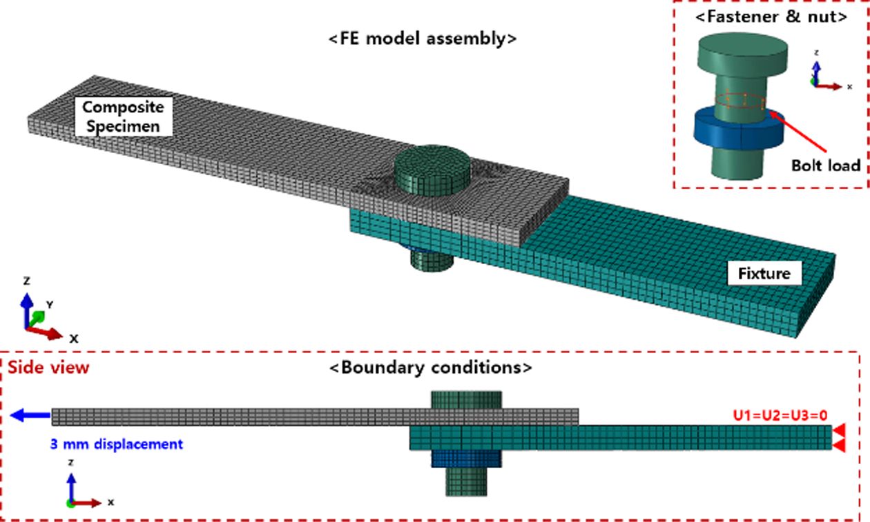 여기서 Fbolt는 볼트에 가해지는 체결력이며, t는 볼트에 가해지는 체결 토크이다. k는 토크 계수로 일반적으로 0.2의 값을 갖는다[25]. d는 볼트의 직경이다. 각 부품들의 접촉 조건을 설정하기 위해 surfaced-based 접촉 조건에 linear penalty method를 이용하였다. 접촉 조건은 복합재료-볼트 헤드, 복합재료-볼트 기둥, 복합재료-금속 치구, 볼트 기둥-금속 치구, 금속 치구-너트 사이에 구성되었다. 복합재료와 금속간 마찰계수는 관련 논문의 값을 인용하여 0.114의 값을 이용하였다[26]. 해석 절차는 크게 두 단계로 나뉜다. 처음 스텝는 볼트에 체결력이 가해지는 단계, 그 다음은 복합재료 볼트 조인트에 인장력이 가해지는 단계이다. 두번째 스텝에서는 Fig. 4에서 보여지는 것과 같이 금속 치구 끝 단의 변위를 고정(U1 = U2 = U3 = 0)하고, 복합재료 시편의 끝 단에 3 mm의 변위 조건을 부여해 시험과 같은 절차를 수행하였다. 본 연구에서는 층간에서 발생되는 파괴 거동은 고려되지 않는다.