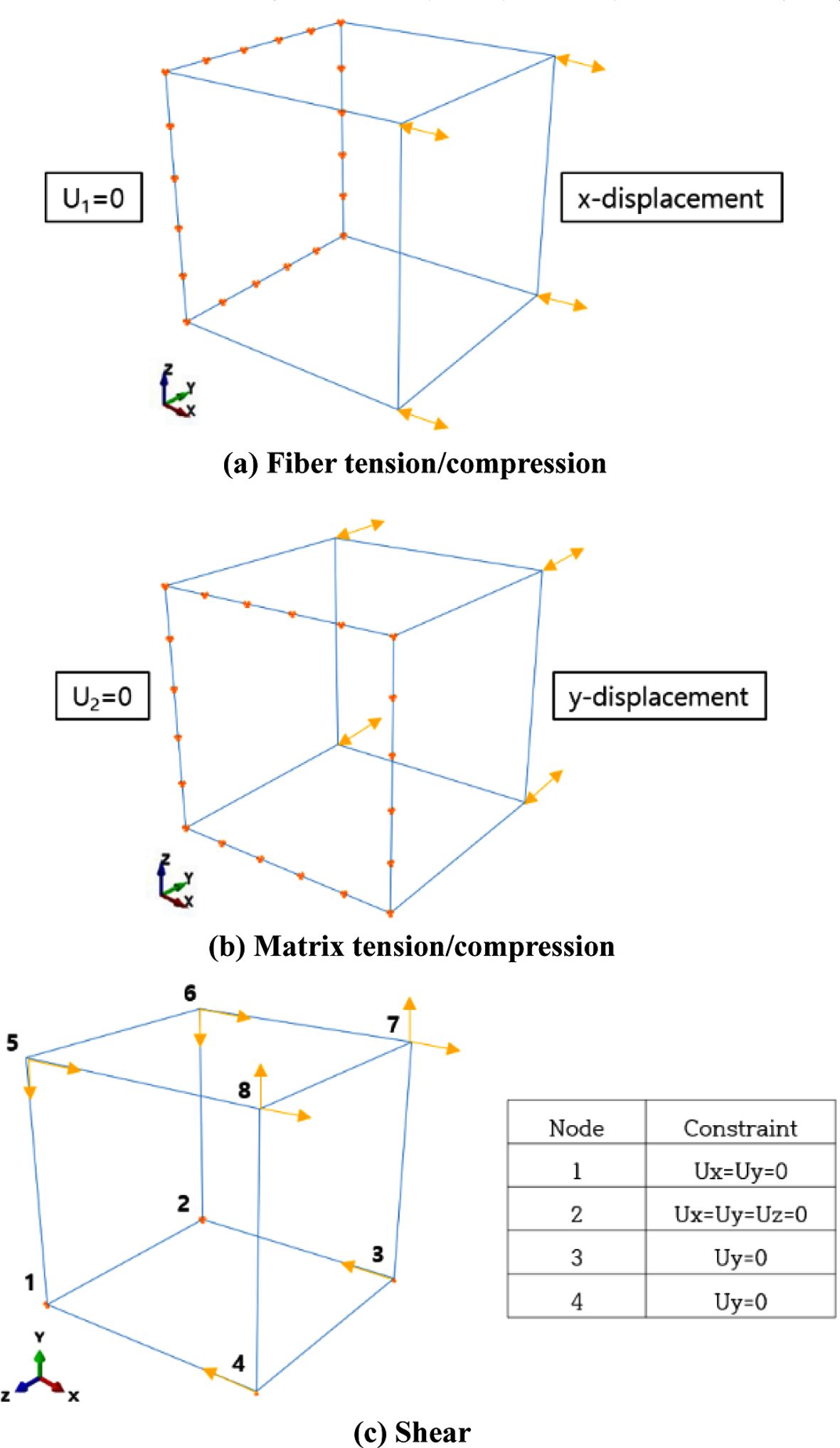여기서, Cft, Cmt, Cmc는 각각 섬유 인장, 기지 인장, 기지 압축 모드에서의 손상 저하계수를 의미한다. 기존 연구[13] 에서는 기지 인장과 기지 압축 모드 손상변수에만 저하계수를 0.9과 0.5로 각각 접목하였으나, 본 연구에서는 보다 정확한 전단 거동을 예측하기 위해 섬유 인장 손상변수까지 포함하여 계수들을 도입하였다. 각 손상 저하계수들을 구하기 위해 반복적인 작업을 수행하며 본 연구에서 사용된 재료에 맞는 계수들을 획득하였고, 그 값들은 섬유 인장, 기지 인장, 기지 압축 손상모드에서 각각 0.8, 0.2, 0.2 이다. 섬유 압축 파손모드의 경우에는 전단 상황에서 영향이 없기 때문에 따로 손상 저하계수를 곱해주지 않았다.