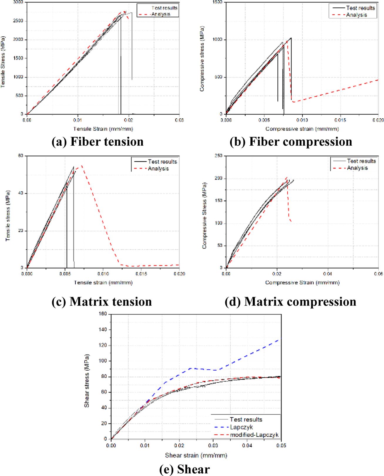 2장에서 수정된 Lapczyk 파손해석 모델의 검증과정을 수행하였다. 검증 과정은 단일요소를 통해 각 파손모드(섬유 인장/압축, 기지 인장/압축, 전단)에서 수행되었다. 단일요소 및 각 파손모드 해석을 위해 단일요소에 가해진 경계 조건은 Fig. 5을 통해 확인할 수 있다. 해석결과는 기계적 물성치를 얻기 위해 수행된 시편 시험결과와 비교되었다. Fig. 6은 단일요소해석과 시험을 통해 획득한 응력-변형률 결과를 보여준다. 각 파손모드에서 강성 및 강도가 정확하게 예측되는 것을 확인하였다. Fig. 6(e)의 전단 파손모드 경우에는 기존 Lapczyk 모델과 수정된 모델에서 획득한 결과를 모두 나타냈으며, 전단 손상변수 계산 과정의 수정을 통해 전단 응력-전단 변형률 거동이 정확하게 예측되는 것을 확인할 수 있다. 이런 과정을 통해 수정된 파손해석 모델이 복합재료의 각 파손 거동을 정확히 예측할 수 있음을 검증하였다.