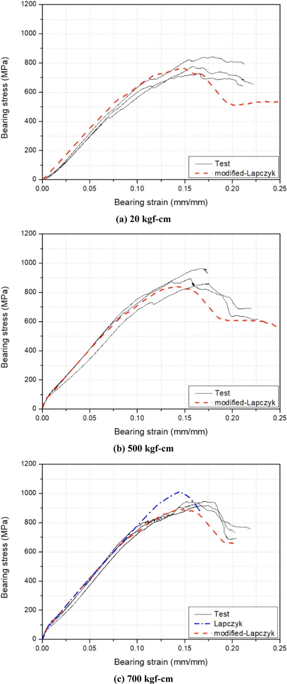 복합재료 볼트 조인트의 시험과 해석을 통해 획득한 베어링 응력-베어링 변형률 거동은 Fig. 7에서 볼 수 있다. 초기 구간에서 체결력에 의해 베어링 응력-베어링 변형률 관계가 달라짐을 확인할 수 있다. 증가된 체결력은 보다 큰 마찰력을 복합재료와 금속 치구 사이에 가하게 되고, 그에 따라 초기 강성이 변화하였다. 그 후, 복합재료 볼트 조인트의 베어링 응력은 초기 파손까지 선형 거동을 보였다. 파손의 발생 후 볼트 조인트의 베어링 응력은 비선형 거동을 보이기 시작하였으며 베어링 강도지점까지 증가하다가 최대 점을 기점으로 감소하는 경향을 보였다. 기존 Lapczyk 모델과 수정된 모델을 시험결과와 비교하기 위해 Fig. 7(c)에 나타내었다. 파손의 발생을 기점으로 두 모델이 큰 차이를 보였다. 기존 Lapczyk 모델은 전체적으로 선형적인 거동을 보이는 반면에 수정된 모델은 시험 결과와 상당히 유사한 거동을 보이는 것을 확인하였다. 수정된 모델은 비선형 거동과 복합재료 볼트 조인트의 강도를 유효한 범위 내에서 예측하였다. 이런 결과를 바탕으로, 비선형 전단 거동을 정확하게 예측할 수 있는 수정 Lapczyk 모델이 기존의 Lapczyk 모델보다 복합재료 볼트 조인트의 파손거동을 정확하게 예측할 수 있다는 것이 확인되었다.