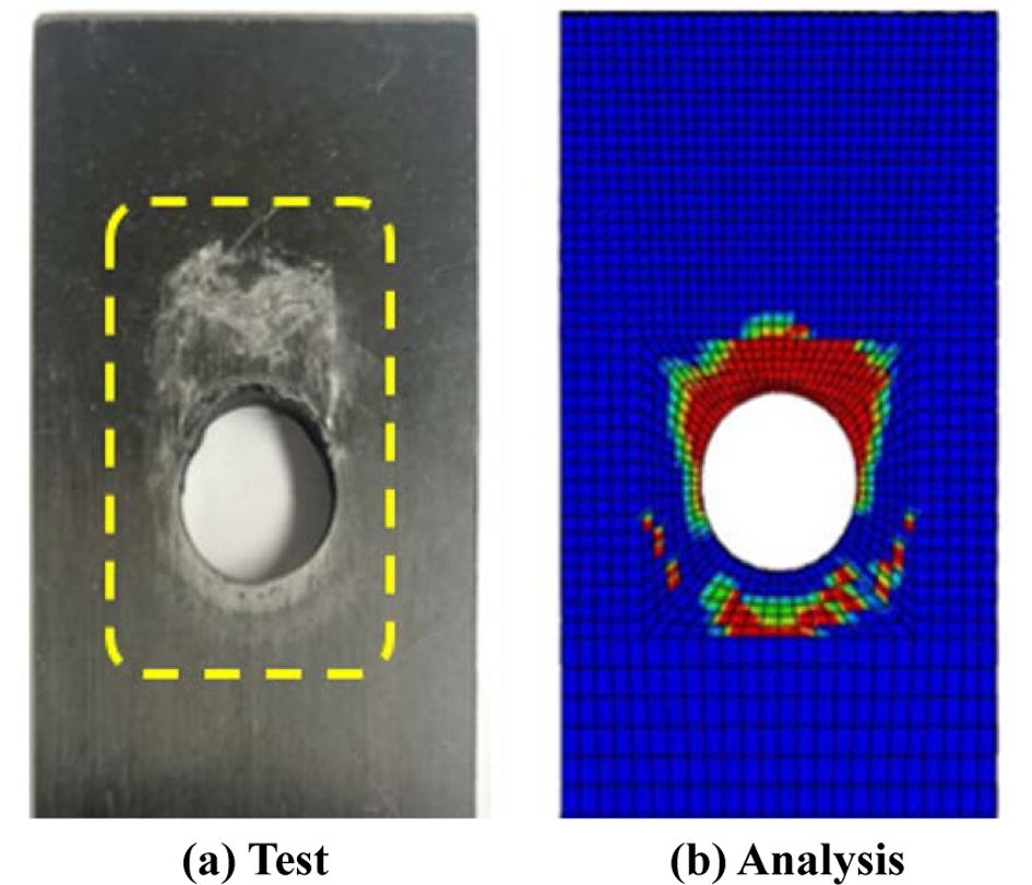 수정된 Lapczyk 모델을 이용하여 예측한 복합재료 볼트 조인트의 파손모드를 확인하였다. 시험된 시편의 파손모드를 파손해석을 통해 예측된 파손모드와 비교하였으며, Fig. 8을 통해 나타냈다. 해석결과는 손상변수를 나타낸 그림으로, 파손이 없는 손상변수가 0의 경우는 파란색, 완전 파단 된 1의 경우는 빨간색으로 나타내었다. 시험된 시편의 파손모드와 파손해석 모델을 통해 예측한 파손모드 모두 bearing 파손모드로 관찰되었다. 파손해석 결과 예측된 컨투어에서 볼트 구멍 아래쪽의 손상은 볼트 헤드에 의한 표면의 손상이다. 수정된 파손해석 모델을 이용하여 수행된 해석 결과가 파손모드를 예측하기에 유효함을 확인할 수 있다.