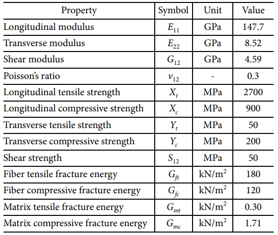 본 연구에서는 T700/Epoxy 복합재료를 사용하였으며 탄소섬유는 TORAY사, 에폭시 기지는 국도 화학에서 제조되었다. 해석을 수행하기 위해 필요한 기계적 물성치와 재료의 파괴에너지는 ASTM 규정[15-19] 및 관련 문헌[20-22]을 참고하여 시험을 통해 획득하였으며, Table 1에서 볼 수 있다. 각 기계적 물성치를 획득하기 위해 인장, 압축 및 전단 시험을 수행하였다. 시편은 해당 복합재료의 프리프레그를 이용하여 vacuum bagging 공정을 통해 제작되었다. 프리프레그 한 장의 두께는 0.15 mm이다. 최종적으로 제작된 복합재료의 섬유 체적 분율은 areal method[23,24]을 통해 계산되었고, 평균적으로 61.37%의 값을 보였다.