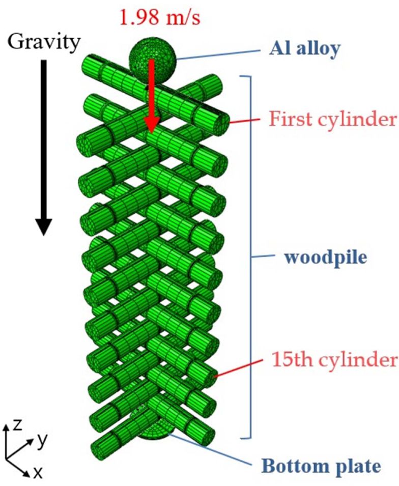 우드파일 메타물질은 적층된 나무토막들과 같은 형상에서 붙여진 이름으로, 적층 방향의 충격이 증가하거나 감소된다. 우물 정(井)의 모양처럼 우드파일들이 여러 개 겹쳐있는 것이 전체 모델이지만, 유한요소해석을 진행하여 충격 변화량을 계산하기 위해 Fig. 1과 같이 우드파일 메타물질의 단일 유닛 모델이 제작되었다. 입력 에너지를 동일하게 적용하기 위해 적층된 20개의 실린더 중 첫번째 우드파일 실린더 위에 -z 방향으로 1.98 m/s의 속도를 가진 알루미늄 합금의 강구를 모델링하였다. 강구가 첫번째 실린더에 전달한 충격을 입력 충격으로 지정되었다. 출력충격을 지정하기 위하여 응력파 이론을 적용하였다. 바닥판에서 올라오는 반사파와 바닥판이 받는 충격이 중첩으로 인해 이것이 정확한 출력충격인지 판단하기 어렵다[9]. 중첩을 고려하지 않고 출력 충격을 확인하기 위하여 바닥판까지 응력파가 도달하는 시간이 계산되었고 바닥까지 응력파가 도달하기 전인 15번째 실린더가 받은 충격을 출력충격으로 지정되었다.