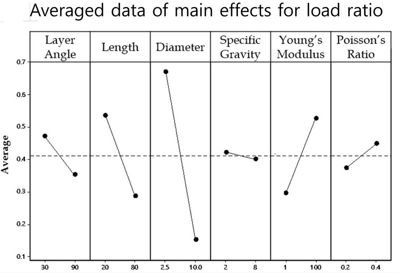 충격저감비에 대한 DOE 분석을 사용하여 주효과도를 분석하였다. 각 변수별 주효과도는 Fig. 3에 나타난 것과 같다. 그 결과, 길이, 적층각도, 지름 그리고 비중이 클수록, 탄성계수, 포아송 비가 작을수록 충격저감이 더 큰 것으로 나타났다. 이는 우드파일 사이의 접촉 면적이 넓을 수록 충격저감에 더 좋다고 사료된다. 특히 직경과 길이가 가장 큰 영향을 끼치는 것으로 나타났는데, 접촉 면적에 가장 크게 영향을 끼치는 인자라고 사료된다. 재료적 변수는 탄성계수가 가장 큰 영향을 끼치는 인자로, 연성이 큰 재질일수록 충격저감이 클 것으로 사료된다.