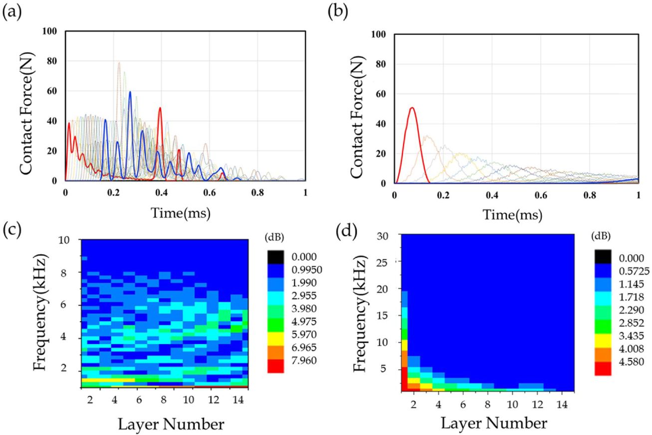 충격 힘을 고속 푸리에 변환하여 주파수 대역에 대한 분석이 진행되었다. Fig. 4에서 (a)는 다중 충격을 받은 실린더의 전달양상을, (b)는 단일 충격을 받은 우드파일 실린더의 전달양상을 나타내며, 빨간 선으로 입력충격을, 파란 선으로 출력충격을 나타냈다. (c)는 다중충격을 받은 실린더의 고속 푸리에 변환을, (d)는 단일 충격을 받은 실린더의 고속 푸리에 변환을 나타내었다. 첫 번째 우드파일이 다중 충격을 받는 경우에는 저주파 대역의 진동이 증폭되는 것으로 나타났고, 고주파의 진동은 거의 유지되었다. 단일 충격을 받는 경우 모든 주파수 대역의 진동이 저감되는 것으로 나타났다. 첫 번째 우드파일이 다중 충격을 받는 경우, 강구가 첫 번째 우드파일에 진동 충격을 주는 것으로 나타났다. 이 때, 첫번째 우드파일이 받는 충격의 진동수가 클수록 일정한 진폭을 지니며 지수적으로 작은 파동열을 갖는 비국소 독방파인 나노프테라(Nanoptera)[13]의 진폭이 더 큰 것으로 나타났다. 다중 충격이 발생하는 경우는 우드파일의 길이가 짧고 각도가 크며, 직경이 작은 경우에 발생되었다. 재료적 변수는 탄성계수가 작을수록 강구의 진동이 많은 다중충격이 발생되었다.