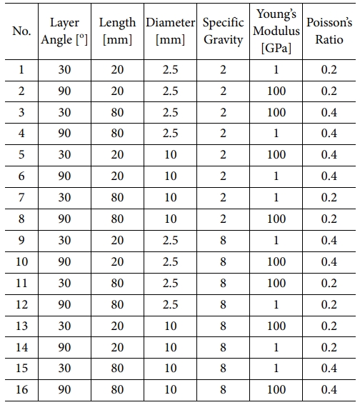 이전의 우드파일 메타물질 연구들은 기하학적 변수만을 조절하여 충격저감이 얼마나 발생되는지 확인했지만, 본 논문에서는 기하학적 변수와 재료적 변수를 동시에 조절하여 충격저감에 주는 영향이 확인되었다. Table 1에 나타난 것과 같이 기하학적 변수로는 우드파일의 각도, 길이, 지름을 두었고, 재료적 변수로는 영률, 포아송 비, 비중이 지정되었다. 총 6가지 변수마다 2개의 인자를 두어 총 16가지의 케이스의 유한요소해석이 진행되었다.