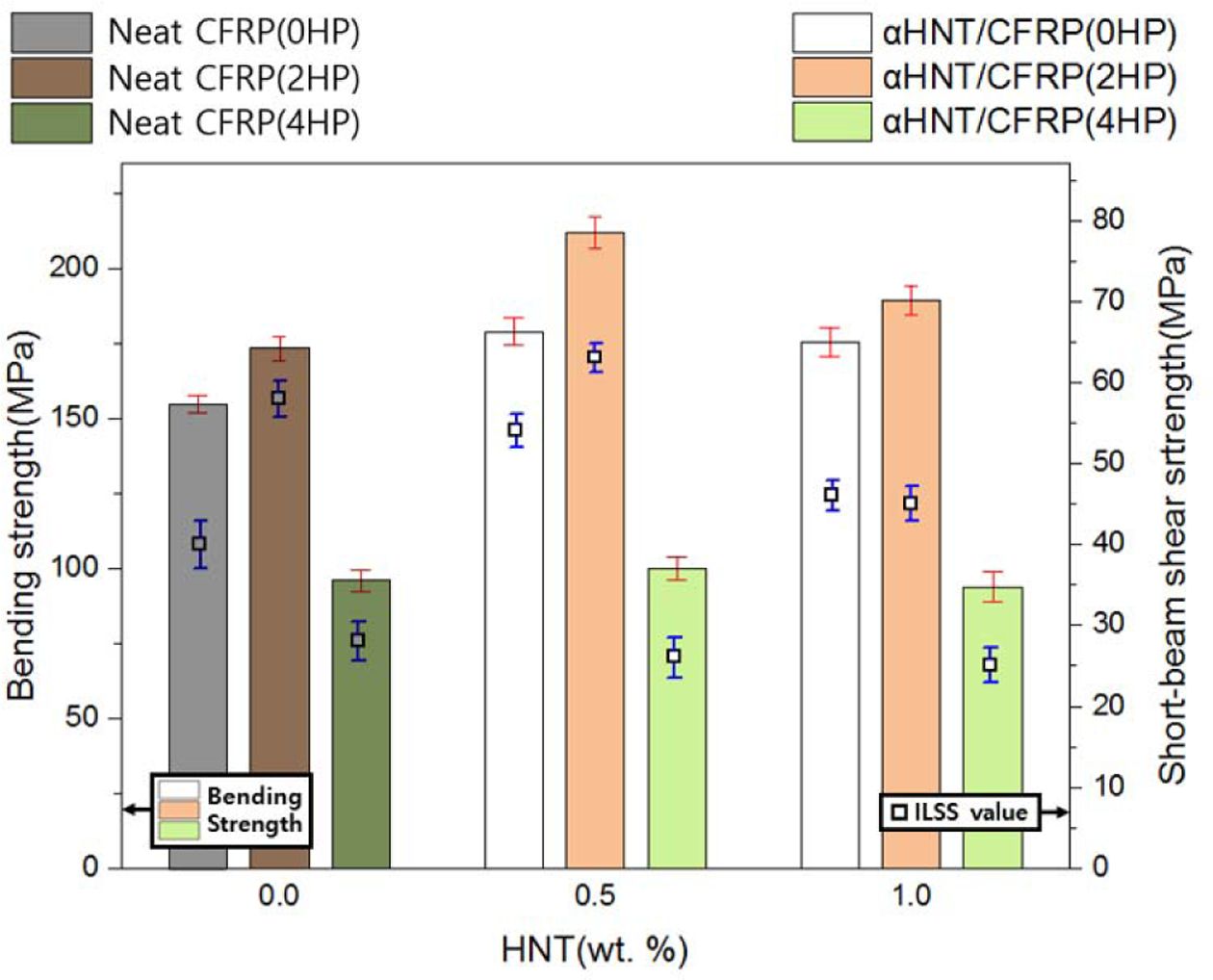 Fig. 1은 HNT/CFRP 파이프의 굽힘, 층간 전단 강도 시험 결과를 나타낸 그래프다. 두 시험 결과 모두 0.5 wt.% HNT가 첨가된 0.5HNT/CFRP(0HP), 0.5HNT/CFRP(2HP)와 0.5HNT/CFRP(4HP)에서 가장 우수한 강도를 나타냈으며, 이는 파괴에 이르기까지 상대적으로 강한 하중이 필요하다는 점을 내포한다. 또한, Neat CFRP(2HP), 0.5HNT/CFRP(2HP)은 각각, 후프 패턴이 추가되지 않은 형태인 Neat CFRP(0HP), 0.5HNT/CFRP(0HP)에 비하여 우수한 강도가 나타난 것으로 보아 길고 안정적인 형태의 탄소성구간이 유지되었음을 예측할 수 있다.