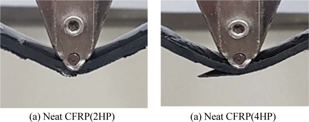 반면에 Neat CFRP(4HP)는 낮은 굽힘 강도를 나타냈다. 이는 압축 하중을 견디는 헬리컬 패턴 내부로의 고른 하중 전달이 일어나지 못해, 상대적으로 가장 약한 이중 패턴 간의 경계면이 우선 분리되어 발생한 현상이다. 이는 Fig. 2를 통해 확인할 수 있다. Fig. 2(a)은 시험편을 가로지르는 균열이 발생한 반면, Fig. 2(b)에서는 섬유 배열 방향을 따라 박리현상이 일어났음을 확인할 수 있다. 이를 통해 헬리컬 층의 비율 대비 후프 층의 두께에 따라 강도 저하 방지를 위한 최적화 비율 설계의 필요성과 그 영향을 확인할 수 있었다.