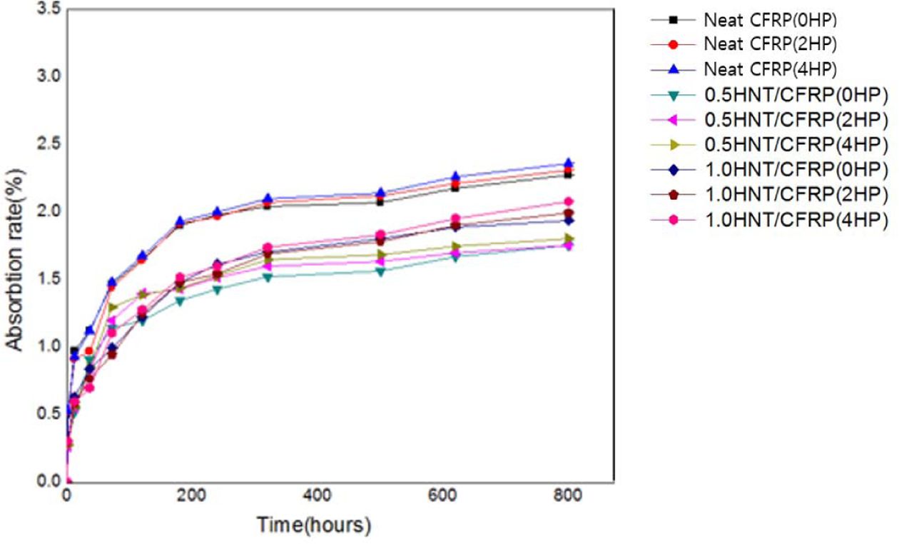 (2) 0.5HNT/CFRP(0HP)은 가장 우수한 내흡습성을 나타냈다. 그러나 1.0HNT/CFRP(0HP)는, 0.5% HNT가 첨가된 시험편에 비해 높은 수분 흡습률을 보였다. 즉, 과도하게 첨가된 입자는 응집된 형태로 내부에 잔존하여 기공과 응력 집중 부위로 작용했으며 이는 수분 흡수를 촉진시켰다.