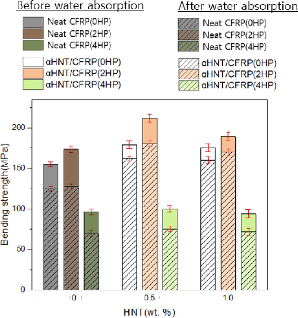 Fig. 4는 HNT/CFRP 파이프의 수분에 의한 열화 전과 후의 굽힘 강도를 비교한 것으로, 항온 수조에서 800시간 시편을 노출시킨 후 수행되었다. 모든 시편은 수분 노출 후의 강도 저하 양상을 보였으며, 이 때 와인딩 패턴과 HNT에 따라 상이한 결과가 나타났다. 흡습 시험 전, Neat CFRP(2HP)의 굽힘 강도는 Neat CFRP(0HP)에 비해 약 10~12% 높았으나, 흡습 시험 이후는 약 4~5% 우수한 강도를 나타냈다. 또한, Neat CFRP(4HP)은 과도하게 적층된 후프 패턴이 대체적으로 낮은 강도 발현에 기인하였다. 즉, 수환경에 노출되는 경우 헬리컬 표면에 적층한 후프패턴이 강도 향상에 큰 영향을 미치지 못했다. 이와 달리, HNT가 첨가된 0.5HNT/CFPR(2HP)의 굽힘 강도는 0.5HNT/CFPR(0HP)와 비교했을 때, 흡습 전과 후 모두 약 15% 우수했다. 이러한 양상은 1.0% HNT 시험편에서도 비슷하게 나타났으며, 0.5%, 1.0% HNT 시험편의 대부분은 HNT 미첨가 시험편에 비해 흡습 전과 후의 강도 저하 폭이 적었고, 이는 HNT의 영향이라 판단된다.