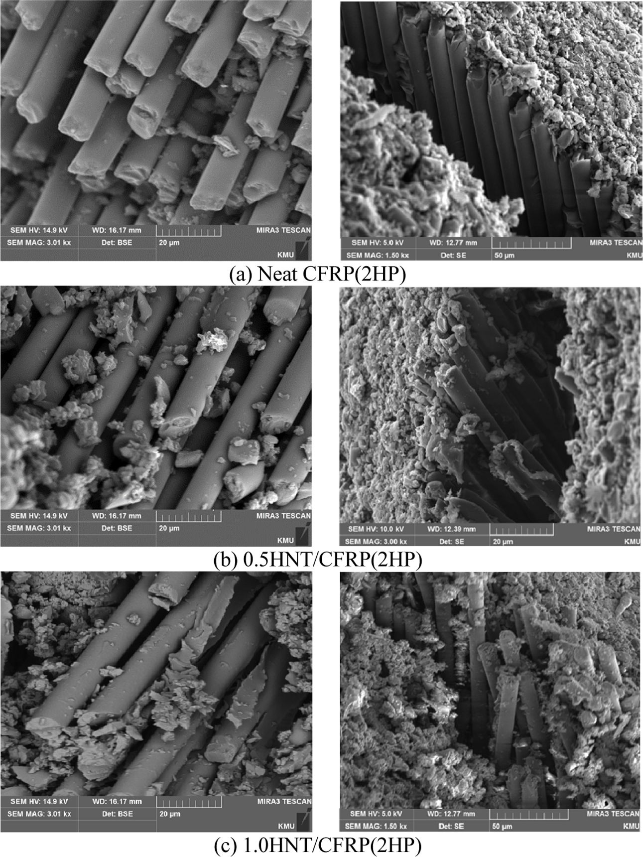 HNT 첨가 CFRP 파이프의 흡습 전과 후에 대한 기계적 성능 및 계면 결합력 증가에 있어, 입자의 거동과 파손 양상을 입증하기 위해 SEM을 활용하여 파단이 발생한 각 패턴 간의 계면을 관찰하였다.