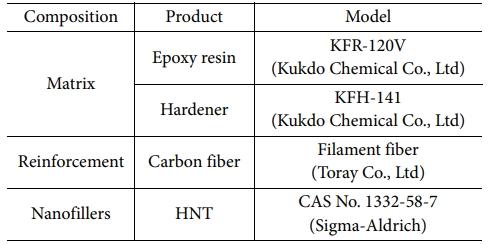 또한, CFRP 파이프의 기계적 물성에 미치는 HNT의 영향과 그 흡습 특성을 분석하기 위하여 HNT의 첨가량은 0.5, 1.0 wt.%로 제한하였다. 이 때, 복합재 내 나노 입자의 응집을 억제하고 고른 분산 상태를 유지하기 위하여 초음파 분산(Ultrasonic homogenization) 장치를 이용하였으며, HNT가 첨가된 에폭시를 500 Watt/20 kHz의 출력 하에 30분간 분산시킨 후, 경화재와 혼합하였다. 이렇게 제작한 기지재를 함침 용기(Resin bath)에 두고, 섬유를 통과시키며 심축에 감는 습식 와인딩(Wet winding) 공법으로 시편을 제조했다.