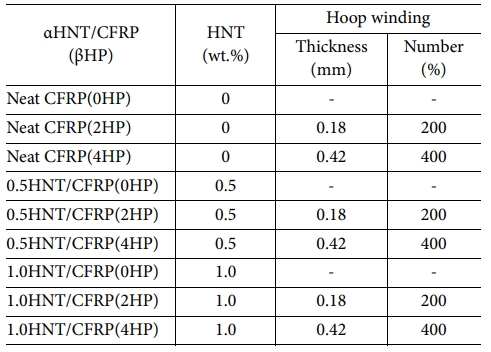 시험편은 위의 Table 2와 같이 αHNT/CFRP(βHP)로 명명하며, α는 첨가된 HNT의 질량을 나타낸다. 또한 후프 패턴의 두께를 제공하였으며, 100%는 맨드릴 축방향 길이로의 1회 편도를 나타낸다. 즉, 해당 논문에서의 후프 와인딩 200은 와인딩 패턴의 1회 왕복을 의미하며, 편의상 2HP로 표현하였다.