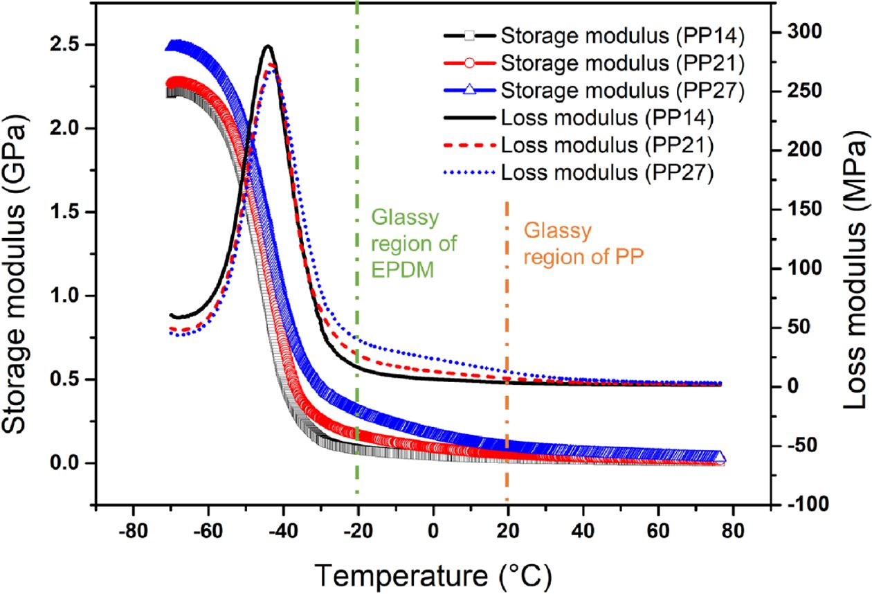 Fig. 1 Temperature-dependent storage and loss modulus curves of the EPDM/PP TPV with three different EPDM/PP ratio |